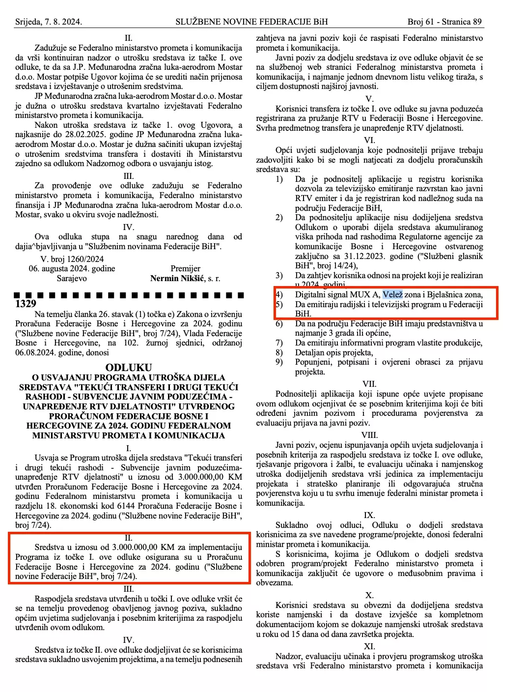 “Vlada Federacije Bosne i Hercegovine, na 102. žurnoj sjednici, održanoj 6. avgusta 2024. godine, donosi odluku o usvajanju programa utroška dijela sredstava “tekući rashodi-subvencije” javnim preduzećima – unapređenje RTV djelatnosti, utvrđenog proračunom Federacije BiH za 2024 godinu Federalnom ministarstvu prometa i komunikacija. Usvaja se Program utroška dijela sredstava “Tekući transferi i drugi tekući rashodi – Subvencije javnim preduzećima-unapređenje RTV djelatnosti” u iznosu od 3.000.000,00 KM utvrđen Budžetom Federacije Bosne i Hercegovine za 2024. godinu Federalnom ministarstvu prometa i komunikacija u razdjelu 18. ekonomski kod 6144 Budžeta Federacije Bosne i Hercegovine za 2024. godinu (“Službene novine Federacije BiH”, broj 7/24). Sredstva u iznosu od 3.000.000,00 KM za implementaciju Programa iz tačke I. ove odluke osigurana su u Budžetu Federacije Bosne i Hercegovine za 2024. godinu (“Službene novine Federacije BiH”, broj 7/24). Raspodjela sredstava utvrđenih u tački I. ove odluke vršit će se na osnovu provedenog obavljenog javnog poziva, u skladu sa općim uslovima učešća i posebnim kriterijima za raspodjelu utvrđenih ovom odlukom”, navedeno je u Odluci Vlade FBiH.