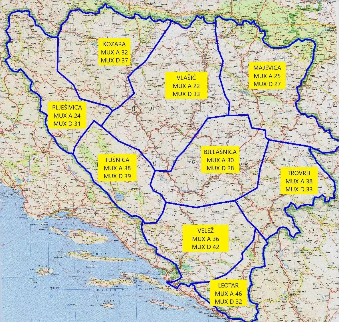 Bosna i Hercegovina je podijeljena na devet digitalnih regija koje su dobile nazive po najvećim relejnim stanicama od prije rata. Digitalni signal se emitira preko MUX A i MUX D.