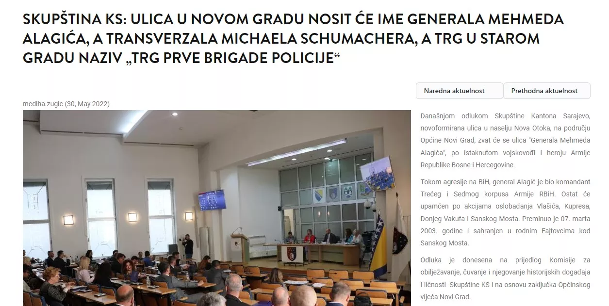 U vijesti koju je objavila Vlada KS 30. maja 2022. godine navodi se da će se odlukom Skupštine Kantona Sarajevo, novoformirana ulica u naselju Nova Otoka, na području Općine Novi Grad, zvati ulica "Generala Mehmeda Alagića", po istaknutom vojskovođi i heroju Armije Republike Bosne i Hercegovine.