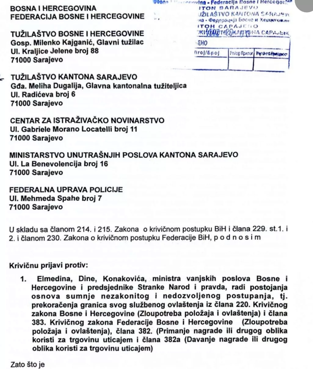 (Patria) - Tužilaštvu Kantona Sarajevo predata je krivična prijava protiv Elmedina Konakovića, ministra vanjskih poslova BiH i predsjednika Naroda i pravde.