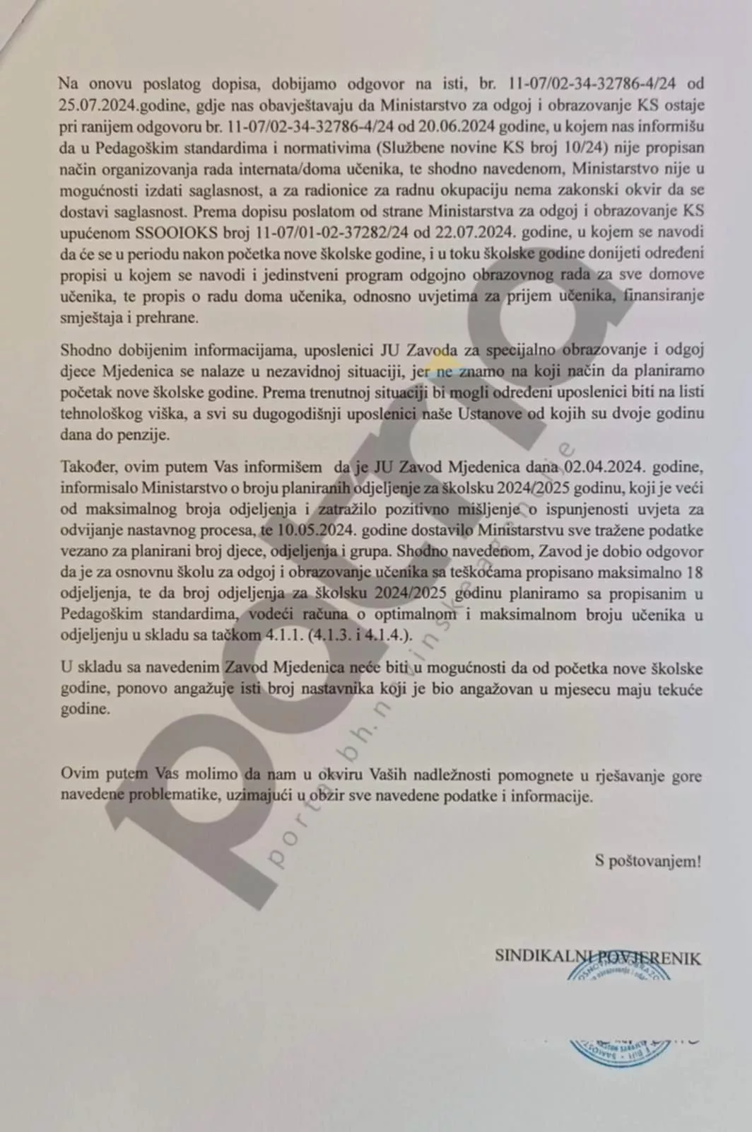 "Od Ministarstva za odgoj i obrazovanje Kantona Sarajevo zahtijeva da odmah izda saglasnost za rad internata i radionica u školskoj 2024/2025. godini. Tražimo da predstavnici Sindikata budu uključeni u kreiranje dokumenata koji podrazumijevaju promjene koje se najavljuju kao sistemska rješenja a pogotovo kada je u pitanju interresorna saradnja.