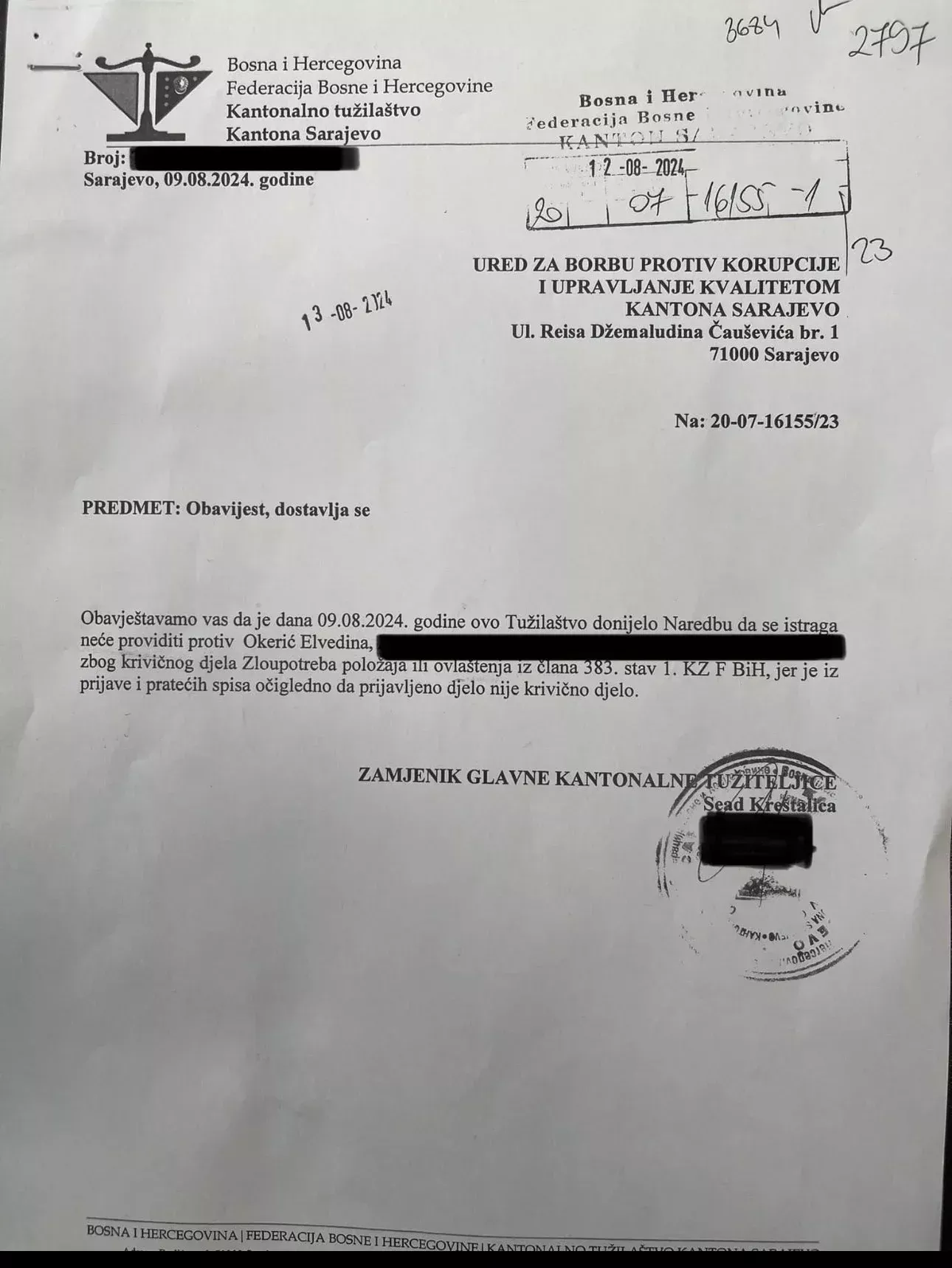 “Obavještamo vas da je dana 9.8.2024. godine Tužilaštvo donijelo Naredbu da se istraga neće provoditi protiv Okrerić Elvedina, zbog krivičnog djela zloupotreba položaja ili ovlaštenja iz člana 383. stav 1. KZ FBiH, jer je iz prijave i pratećih spisa očigledno da prijavljeno djelo nije krivično djelo”, naveo je u svojoj odluci kantonalni tužilac Sead Kreštalica.