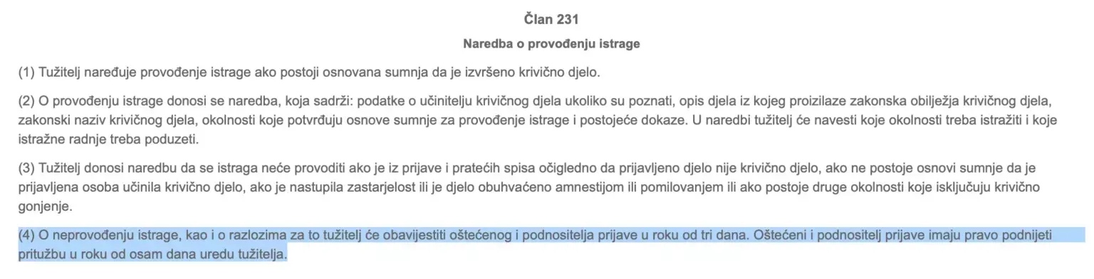 “O neprovođenju istrage, kao i o razlozima za to tužitelj će obavijestiti oštećenog i podnositelja prijave u roku od tri dana. Oštećeni i podnositelj prijave imaju pravo podnijeti pritužbu u roku od osam dana uredu tužitelja”, navedeno je u 231 Zakona o krivičnom postupku Federacije BiH.
