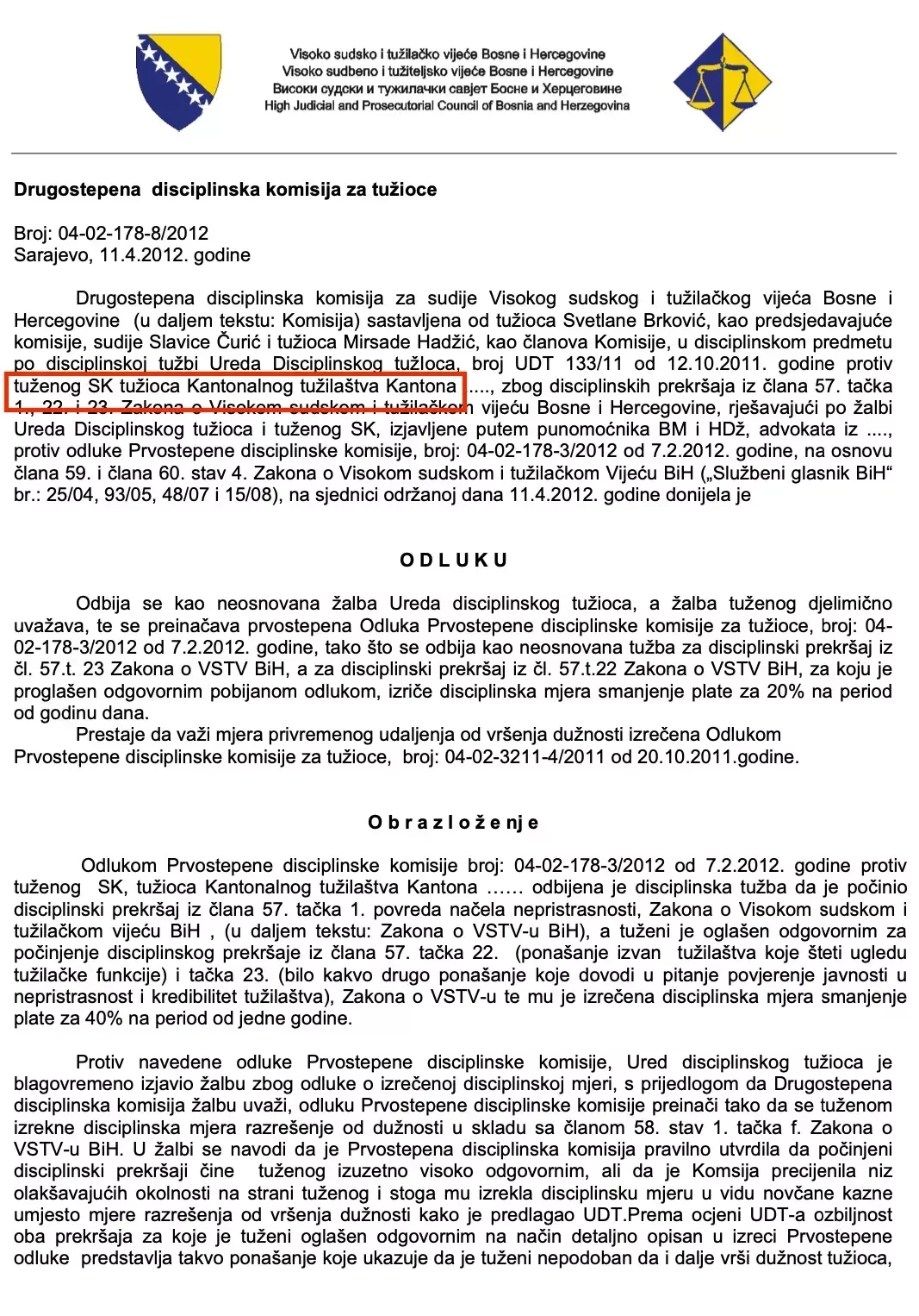 No, prije nego je Kreštalica preduzeo konkretne poteze, reagirao je Ured disciplinskog tužioca VSTV-a koji je 2011. godine zatražio razrješenje tužitelja Kreštalice. Odlukom Prvostepene disciplinske komisije iz oktobra 2011. godine Kreštalica je suspendiran do okončanja postupka, ali je u aprilu 2012. godine Drugostepena komisija VSTV-a ukinula odluku o suspenziji, te je tužitelj kažnjen smanjenjem plaće u iznosu od 20 posto u trajanju od godinu dana.