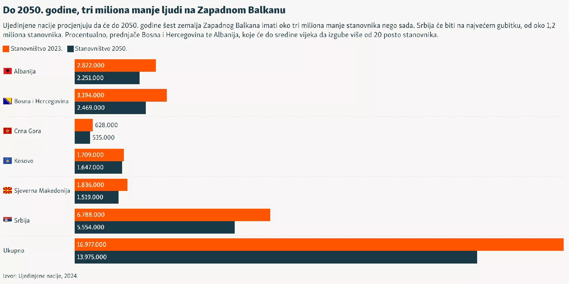 (Patria) - Ujedinjene nacije procjenjuju da će do 2050. godine šest zemalja Zapadnog Balkana imati oko tri miliona stanovnika manje nego što ih imaju sada, prenosi Radio Slobodna Evropa (RSE).