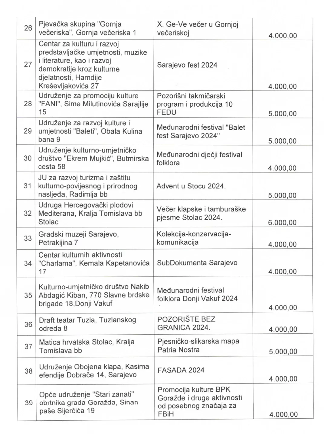 Za Festival klapske presume u Posušju izdvojeno je 10 hiljada KM., za “Loline horske večeri” u Sarajevu – četiri hiljade KM. Za “Noć vještica” Sarajevske filharmonije je izdvojeno sedam hiljada KM, a za Festival sevdalinke u Tuzli četiri hiljade KM. Za Mediteran film festival u Širokom Brijegu je izdvojeno sedam hiljada maraka, a za Tuzlanski film festival pet hiljada KM.