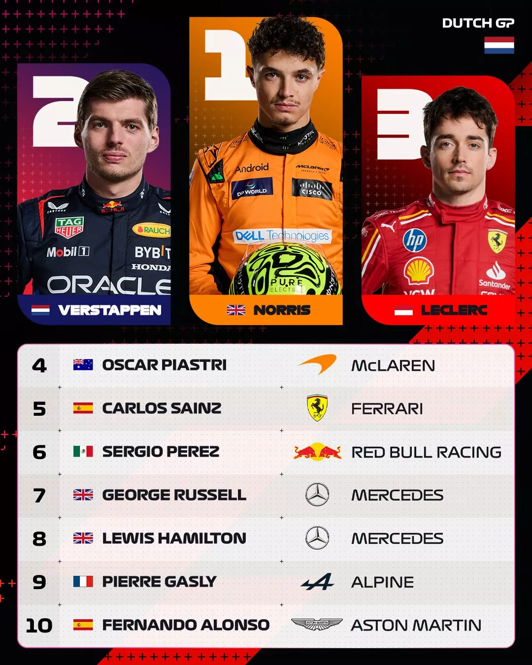 (Patria) - Lando Norris uvjerljivo je danas slavio na Velikoj nagradi Nizozemske nakon što je prestigao Maxa Verstappena na stazi, koji je poveo na startu utrke, a Charles Leclerc odvozio je briljantnu utrku i završio treći.