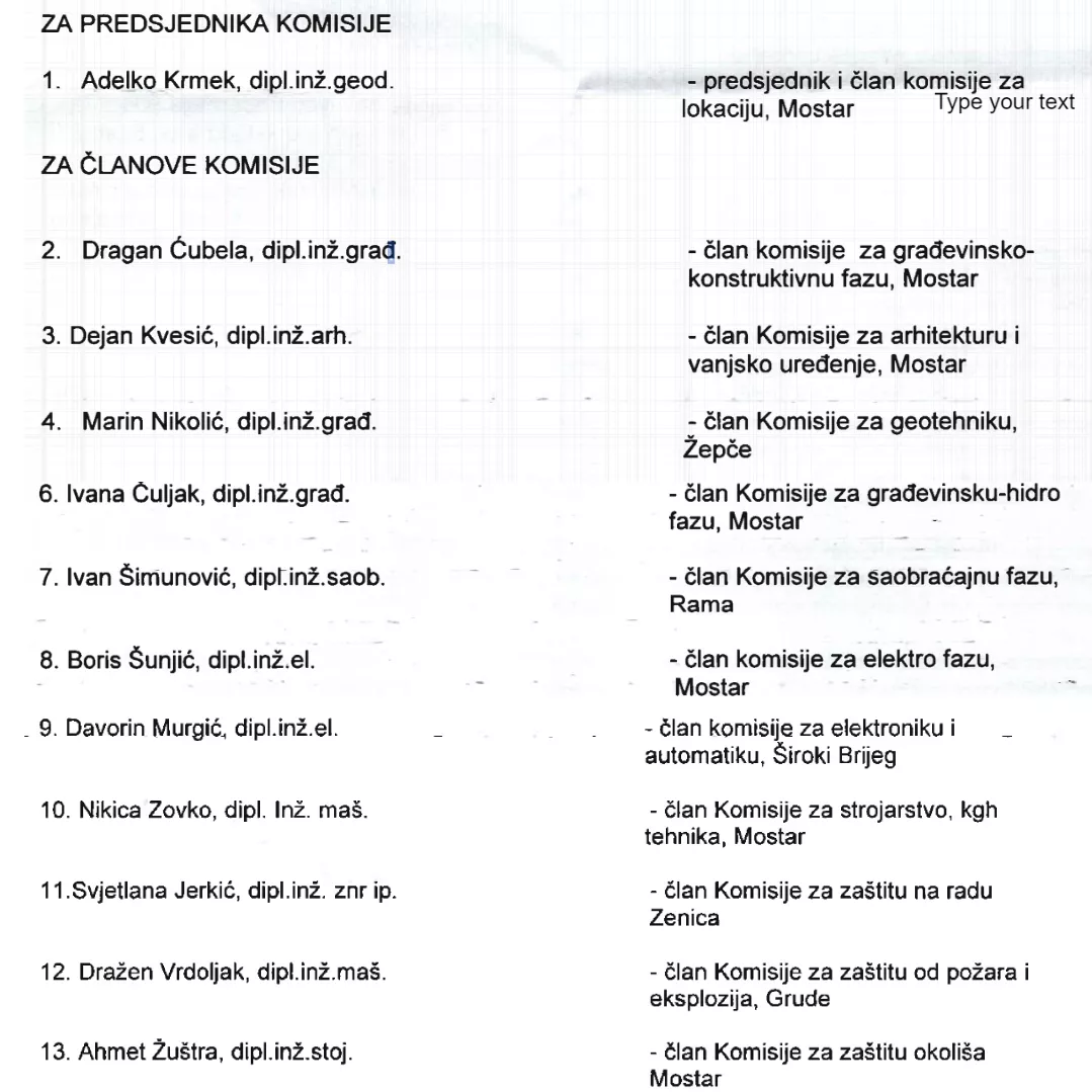 Ova komisija brojala je 13 članova. Među ovih 13 članova komisije samo je jedan Bošnjak Ahmet Žustra, dip.inž. strojarstva. Adelko Krmek, dipl. Inž. geodezije je predsjednik komisije.
