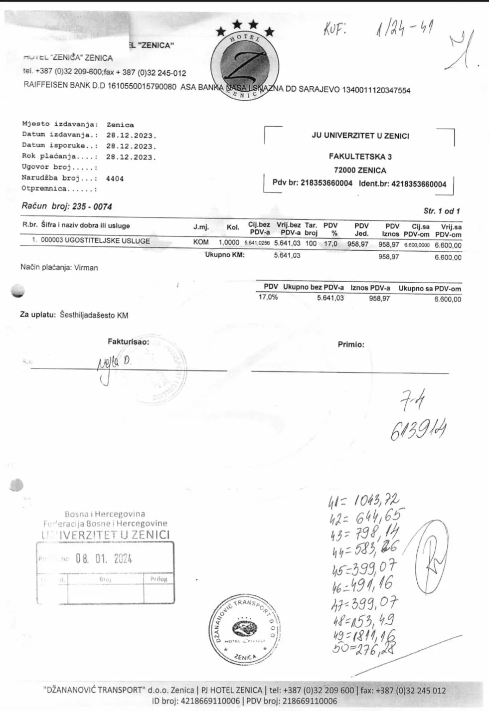 Još jedan račun je sporan. Jedan zenički hotel je ovom Univerzitetu ispostavio račun na iznos od 6.600 KM za pružene ugostiteljske usluge, a radi se o novogodišnjoj fešti koju je Univerzitet organizovao za svoje zaposlenike.