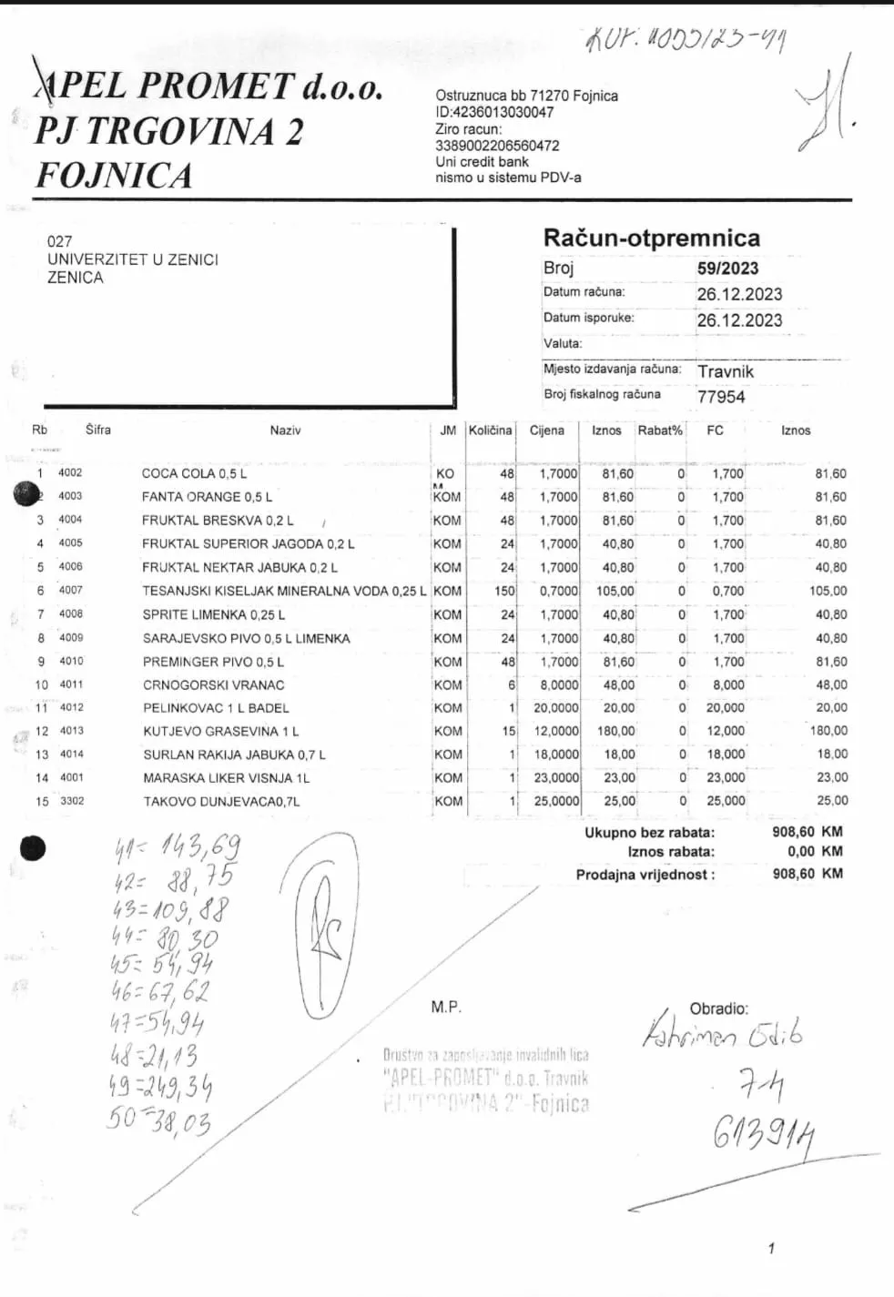 A, rastrošnosti je bilo i bahaćenju od strane univerzitetskog menadžmenta, a koje najbolje ilustruju računi u čijem smo posjedu. Naime, firma Apel promet d.o.o. PJ Trgovina 2 Fojnica ispostavila je zeničkom Univerzitetu račun za isporučeno piće, sokove i vodu, ali i pivo, vino te žestoka pića u vrijednosti od 908,60 KM!