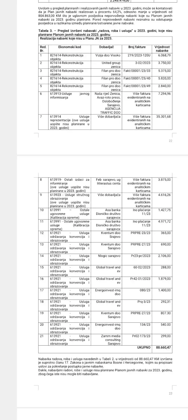 Umjesto zaključka, podsjećamo da je u Izvještaju o poslovanju Univerziteta u Zenici u 2023. godini konstatovano da je Plan javnih nabavki realizovan u procentu od tek 64,2 posto, a nabavke radova, roba i usluga u vrijednosti od 88.660,47 KM izveršena je suprotno članu 17. Zakona o javnim nabavkama BiH, kojim su propisani uslovi za pokretanje postupka javne nabavke.