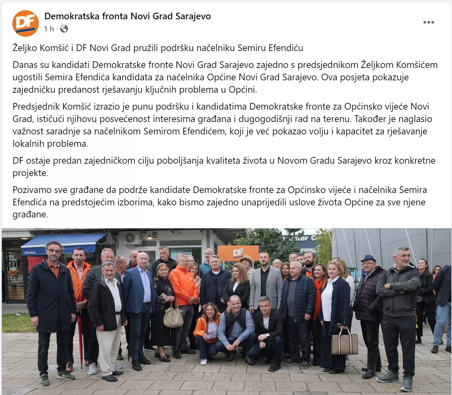 "Danas su kandidati Demokratske fronte Novi Grad Sarajevo zajedno s predsjednikom Željkom Komšićem ugostili Semira Efendića, kandidata za načelnika Općine Novi Grad Sarajevo.