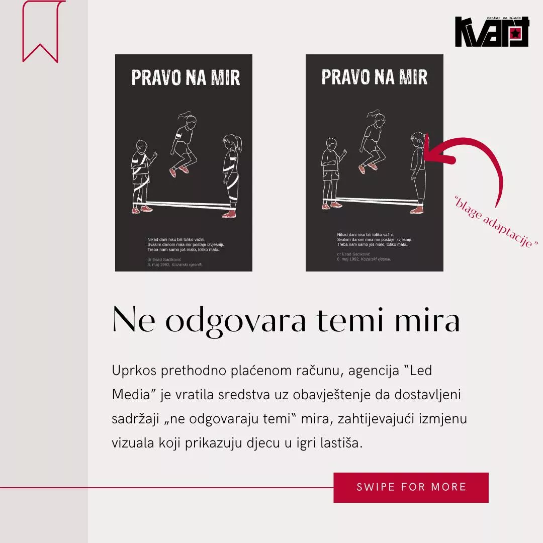 „Ta usluga prethodno je bila dogovorena. Uprkos prethodno plaćenom računu, ova agencija je vratila sredstva uz obavještenje da dostavljeni sadržaji „ne odgovaraju temi“ mira, zahtijevajući izmjenu vizuala koji prikazuju djecu u igri lastiša. Sporni motiv djece ističe pravo na mir kao pravo koje nam pripada rođenjem, samim postojanjem i pripadanjem ljudskoj zajednici. Zato se, u ime prava današnje djece i mladih da svoj život provedu u miru, a povodom Međunarodnog dana mira sjećamo onih kojima je to pravo bilo oduzeto zajedno sa životom“, navode iz Kvarta.