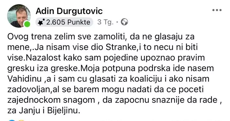 Durgutović je potvrdio da podržava Vahidina Mulamustafića kao kandidata za gradonačelnika Bijeljine.