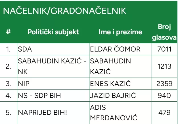 Enes Kazić (NIP) osvojio je 2.359, Sabahudin Kazić (Nezavisni kandidat) 1.213, Jazid Bajrić (NS-SDP) 940, a Adis Merdanović (Naprijed BiH) 479 glasova.
