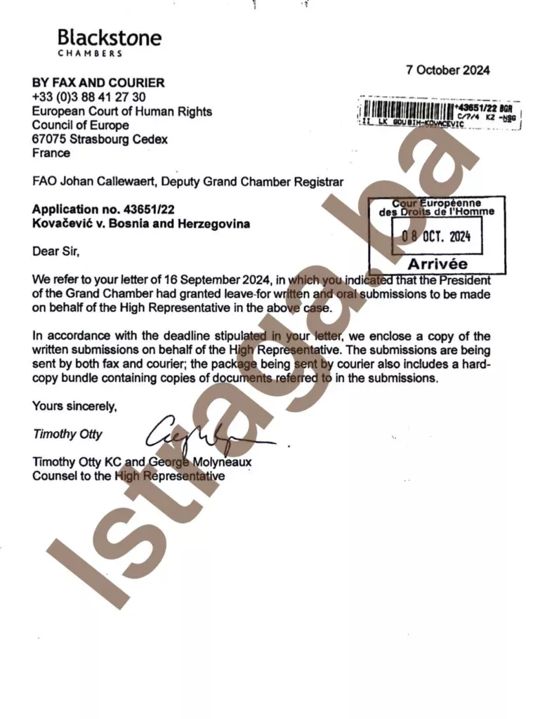Trenutna situacija u BiH zahtijeva oprez prije donošenja odluke koja bi mogla biti protumačena kao delegitimiranje ustavnog okvira BiH u cjelini, piše u pismu koje je, u okviru predmeta "Slaven Kovačević protiv BiH", britanska advokatska kancelarija Blackstone Chamber u ime visokog predstavnika Christiana Schmidta dostavila Evropskom sudu za ljudska prava u Strazburu.