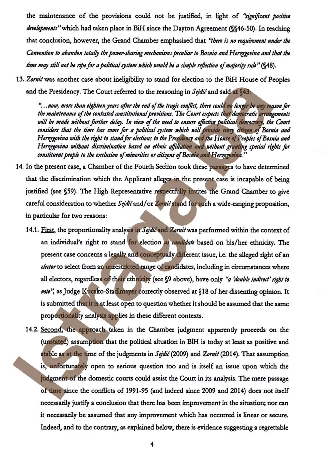"Ako i u mjeri u kojoj je potrebno procijeniti je li bilo kakvo miješanje u prava podnositelja zahtjeva prema članu 14. i/ili A1P12 razmjerno, visoki predstavnik poziva Veliko vijeće da uzme u obzir njegovu ocjenu trenutne političke situacije u BiH, kako je naveo u svojim periodičnim izvještajima generalnom sekretaru Ujedinjenih naroda.