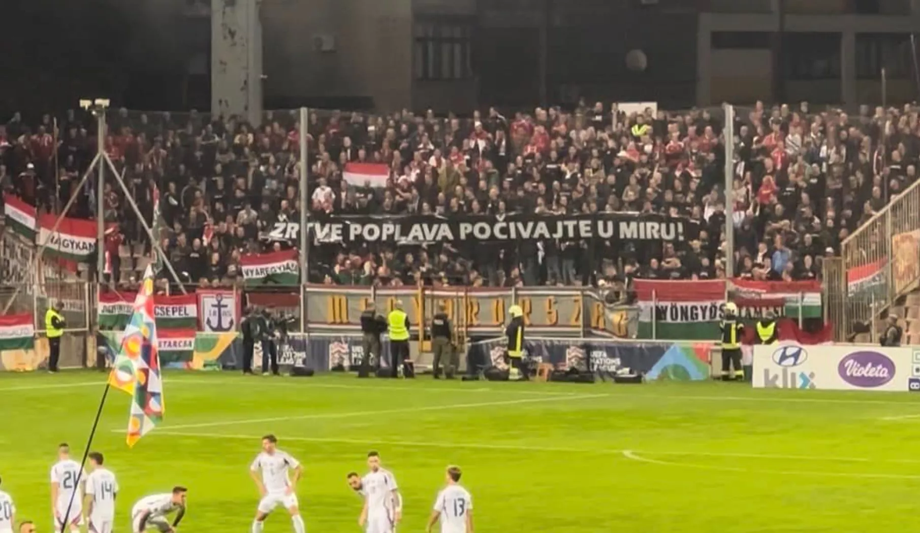 Mađari su u gostujućem sektoru istakli transparent sa porukom "Žrtve poplava počivajte u miru".