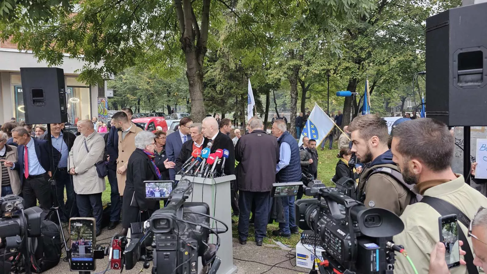 Kao što možete vidjeti na našim fotografijama, sve je spremno za obraćanje intelektualaca, a prisutan je i nemali broj građana koji su sa sobom ponijeli zastave Republike Bosne i Hercegovine s ljiljanima. A tu su i neke parole poput "Bosna je zemlja svih njenih Slavena" i "Provedite presude ESLJP".