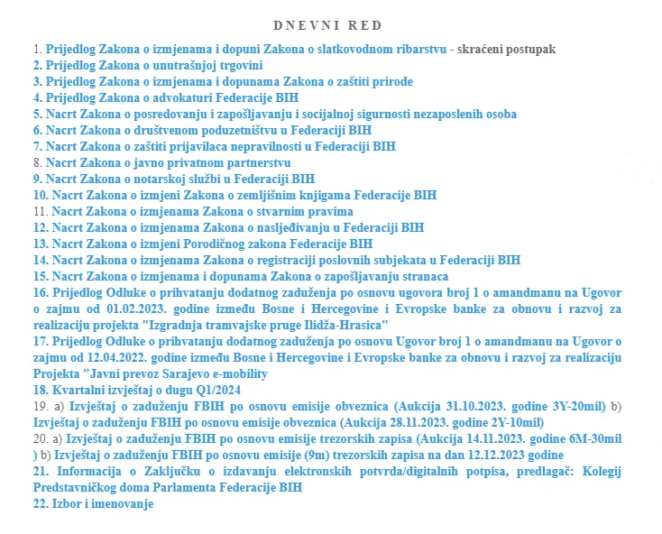 Na dnevnom redu su brojni zakoni i odluke, a o nekim od tih akata jučer je obavljena rasprava. No, nije glasano već će to biti obavljeno danas po završetku rasprave o svakoj tački dnevnog reda.