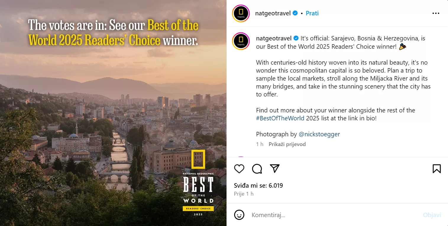 National Geographic Travel ovaj izbor proveo je na svojoj Instagram stranici prije šest dana kada se Sarajevo našlo među pet svjetskih destinacija.