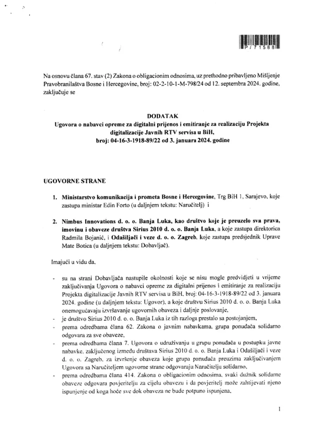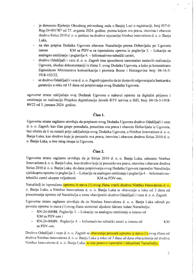 U aneksu, koji je u septembru ove godine ministar Edin Forto potpisao sa pomenutom zagrebačkom firmom i društvom Nimbus Innovations d.o.o iz Banjaluke koje je preuzelo sva prava, imovinu i obaveze sankcionisanog Siriusa 2010, stoji da je do dana potpisivanja aneksa isporučena cjelokupna oprema iz dva, od ukupno 10 poglavlja ugovora, i to poglavlja 3. – Lokacije za analogno emitovanje i poglavlja 4. Informativno-tehnički centri, a ukupne vrijednosti isporučene opreme su sakrivene u kopiji aneksa koji je dostavljen TI BiH-u.