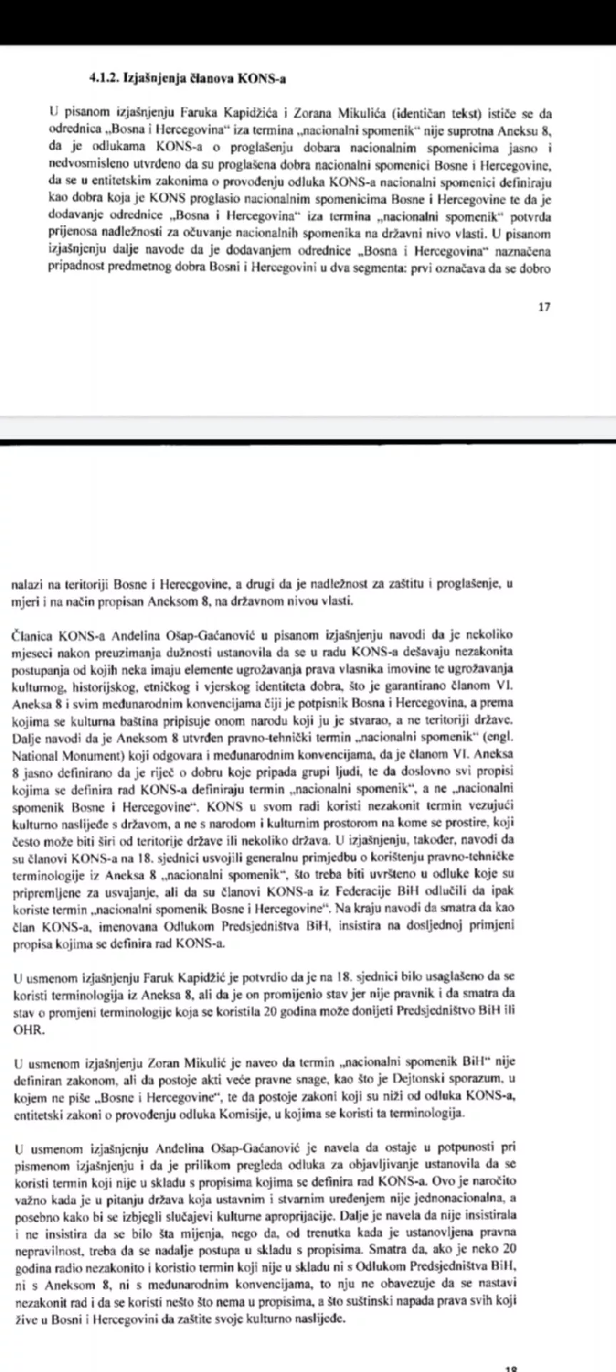 “KONS u svom radu koristi nezakonit termin vezujući kulturno naslijeđe s državom, a ne sa narodom i kulturnim prostorom na kome se prostire, koji često može biti širi od teritorije države ili nekoliko država. Članovi KONS-a su na 18. sjednici usvojili generalnu primjedbu o korištenju pravno-tehničke terminologije iz Aneksa 8 “nacionalni spomenik”, što treba biti uvršteno u odluke koje su pripremljene za usvajanje, ali su članovi KONS-a iz Federacije BiH odlučili da ipak koriste termin “nacionalni spomenik Bosne i Hercegovine”, navodi se u izjašnjenju Ošap-Gaćanović.