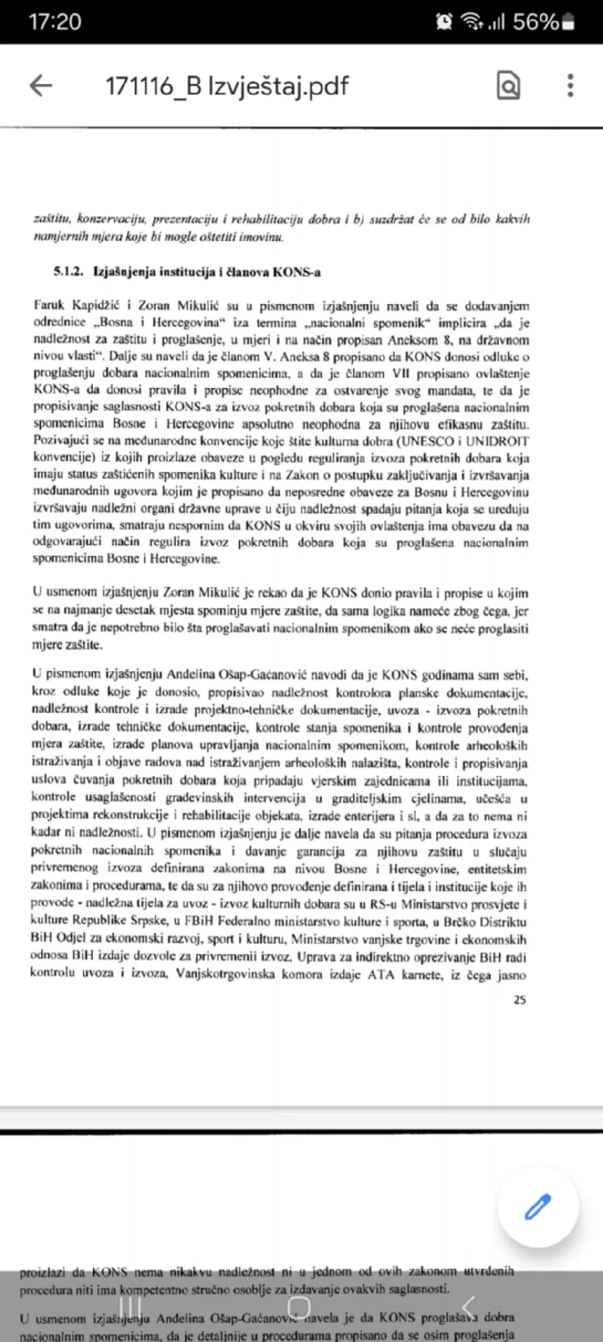 U istom izvještaju je i izjašnjenje Ošap-Gaćanović koja smatra da se “kulturna baština pripisuje onom narodu koji ju je stvarao, a ne teritoriji države te da se treba zvati nacionalni spomenik, a ne nacionalni spomenik Bosne i Hercegovine.”