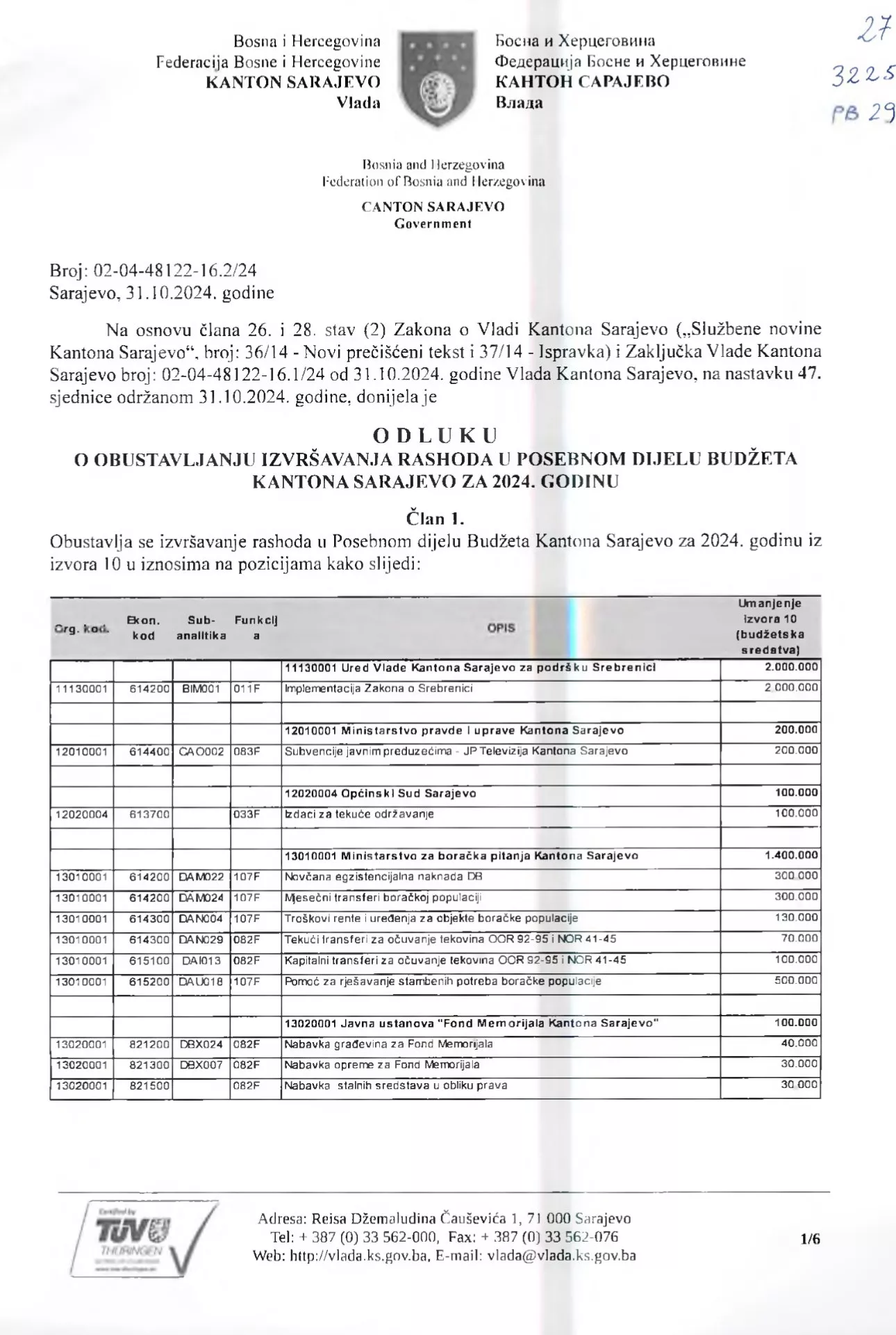 Budžetom za 2024. godinu bilo je planirano 2.104.888 KM za rad Ureda Vlade KS za pomoć Srebrenici, a planirano je i šest uposlenih. No, umjesto Ureda za Srebrenicu, Vlada KS je donijela odluku o obustavi izvršavanja rashoda u Budžetu KS za 2024. među kojima je i budžetska stavka - Implementacija Zakona o Srebrenici.