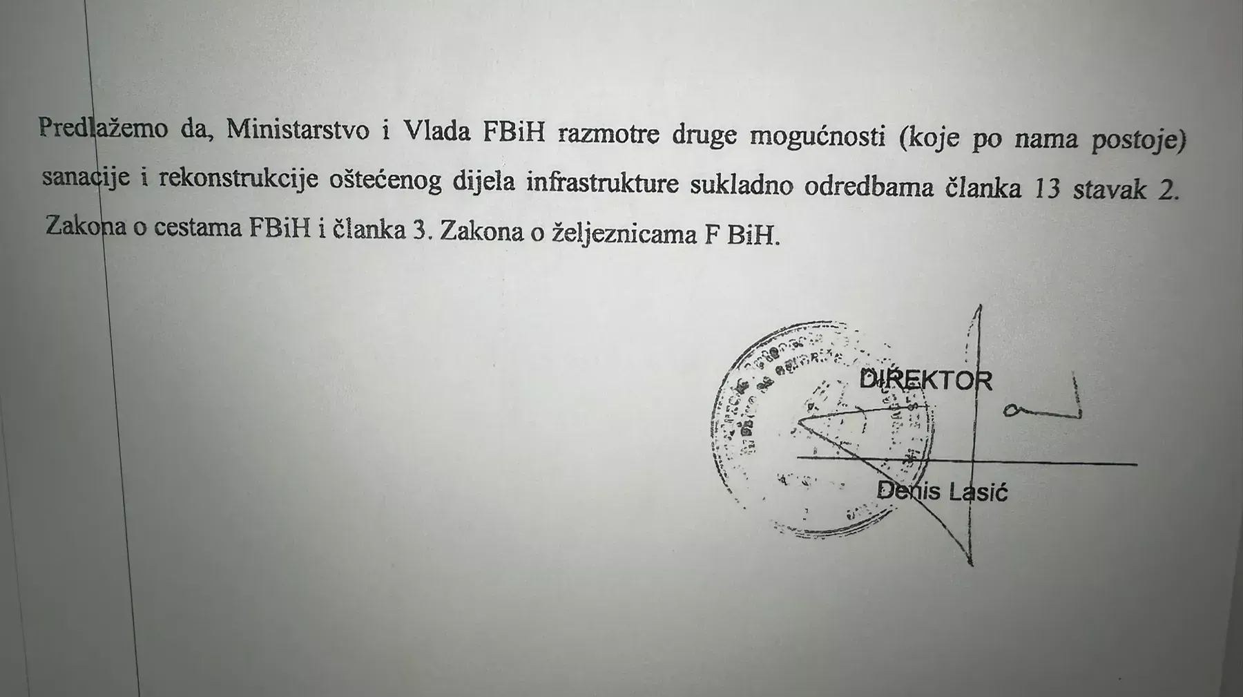 "Predlažemo da Ministarstvo i Vlada FBiH razmotre druge mogućnosti sanacije i rekonstrukcije oštećenog dijela infrastrukture u skladu sa Zakonom o cestama FBiH i Zakona o željeznicama FBiH.