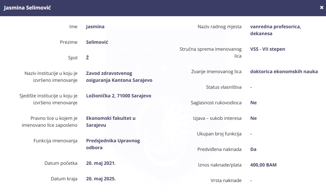 Takav slučaj je upravo sa Jasminom Selimović. Ona je predsjednica Upravnog odbora Zavoda zdravstvenog osiguranja KS još i prije nego će Predsjedništvo BiH u decembru 2023. imenovati novi saziv Upravnog vijeća Centralne banke BiH, koji čine prof. dr. Jasmina Selimović, prof. dr. Mirza Kršo, prof. dr. Danijela Martinović, prof. dr. Darko Tomaš i prof. dr. Radomir Božić.