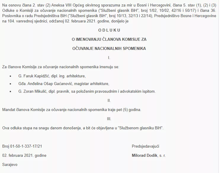 Kada je riječ o imenovanjima, odnosno razrješenju članova Komisije za očuvanje nacionalnih spomenika različita je procedura Predsjedništva BiH.