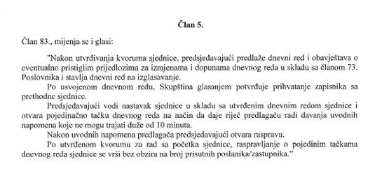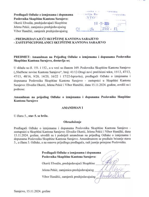 No, na stranici Skupštine KS objavljen je i amandman predlagača Odluke o izmjenama Poslovnika Elvedina Okerića, Jelene Pekić i Vibora Handžića koji traže brisanje člana 5. koji su podnijeli 15. novembra.