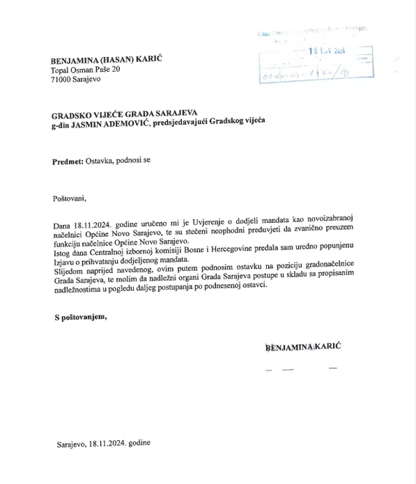 (Patria) - Benjamina Karić, načelnica općine Novo Sarajevo jučer je i zvanično prihvatila mandat načelnice, te je Gradskom vijeću dostavila pismo ostavke na poziciju gradonačelnice Sarajeva.