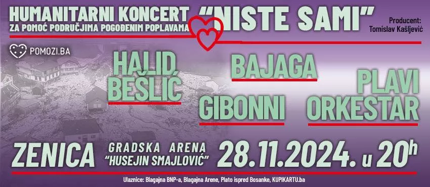 (Patria) - Publika iz cijele Bosne i Hercegovine, ali i regiona odbrojava dane do velikog humanitarnog koncerta "Niste sami", zakazanog za četvrtak, 28. novembra u zeničkoj Areni.