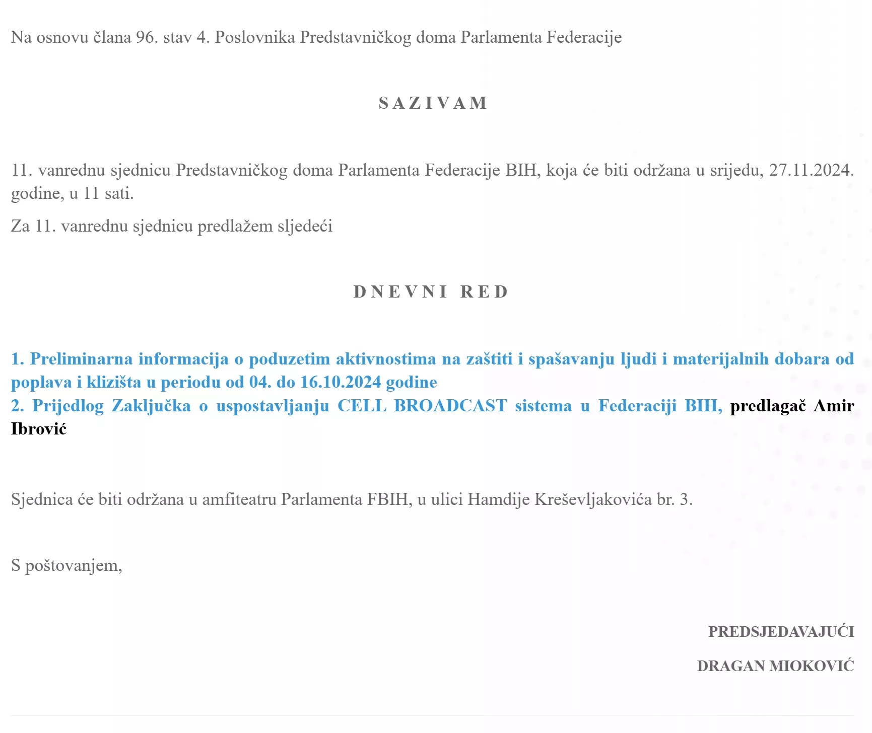 - Prijedlog Zaključka o uspostavljanju CELL BROADCAST sistema u Federaciji BIH, predlagač Amir Ibrović.