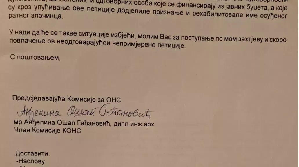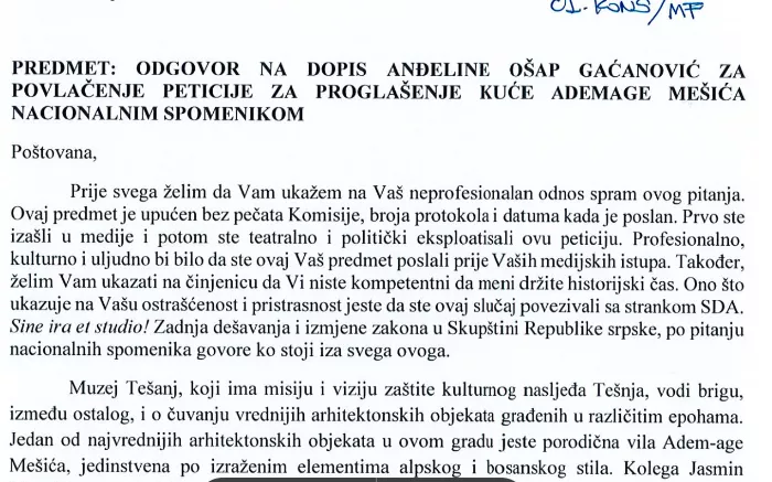 U dopisu se navodi i da je Ošap Gaćanović prvo izašla u medije i politički ekspolatisala priču, na način da je cijeli slučaj povezala sa SDA.