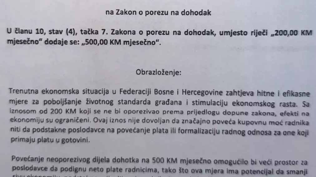 Sličan su uputili i iz Naroda i pravde: “U članu 10, stav (4), tačka 7. Zakona o porezu na dohodak, umjesto riječi „200,00 KM mjesečno" dodaje se:,,500,00 KM mjesečno".