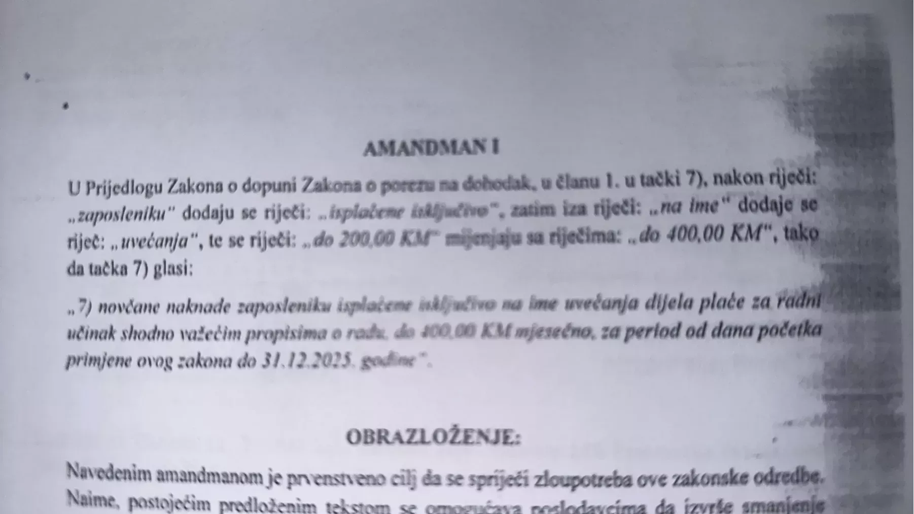Naime, na predloženi zakon po skraćenoj proceduri stigli su i amandmani. Jedan je došao iz Kluba Naše stranke i u njemu se kaže sljedeće: “U Prijedlogu zakona o dopuni Zakona o porezu na dohodak, u članu 1. u tački 7), nakon riječi: „zaposleniku" dodaju se riječi: “isplaćene isključivo", zatim iza riječi: ...na ime" dodaje se riječ: „uvećanja", te se riječi: “do 200,00 KM” mijenjaju sa riječima: “do 400,00 KM”, tako da tačka 7) glasi:
