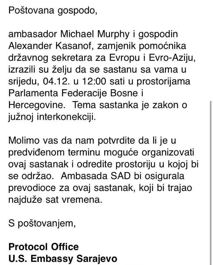 Ambasador Sjedinjenih Američkih Država u Bosni i Hercegovini Michael Murphy, zajedno sa zamjenikom pomoćnika državnog sekretara SAD za Evropu i Evroaziju Alexanderom Kasanofim, zatražio je sastanak s predstavnicima političkih stranaka zastupljenih u Predstavničkom domu Parlamenta FBiH.