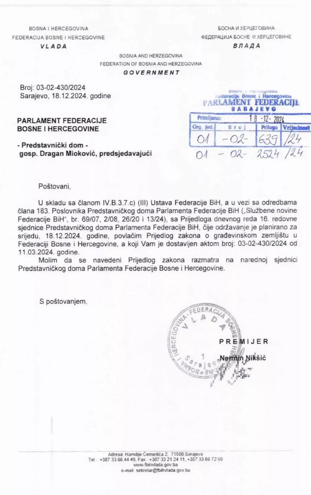 (Patria) - Prijedlog zakona o građevinskom zemljištu u Federaciji Bosne i Hercegovine neće se naći na dnevnom redu današnje sjednice Zastupničkog doma Parlamenta FBiH.