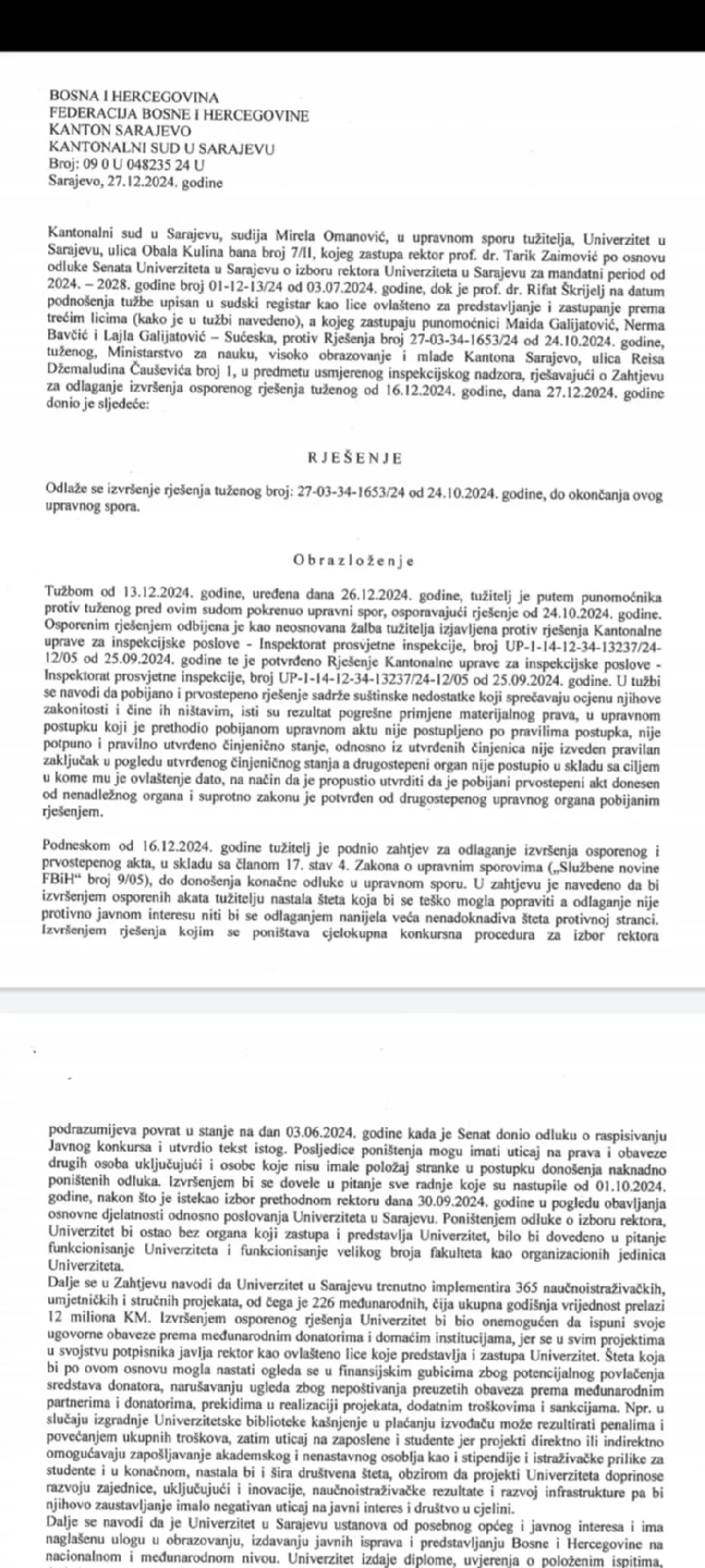 (Patria) - Kantonalni sud u Sarajevu u petak 27. decembra donio je rješenje kojim se odlaže izvršenje rješenja od 24.10.2024. godine do okončanja upravnog spora, a u vezi poništenja izbora rektora UNSA Tarika Zaimovića koje je donijela Kantonalna uprava za inspekcijske poslove (KUIP), a potvrdilo i Ministarstvo za nauku, visoko obrazovanje i mlade KS odbijajući žalbu Univerziteta u Sarajevu.