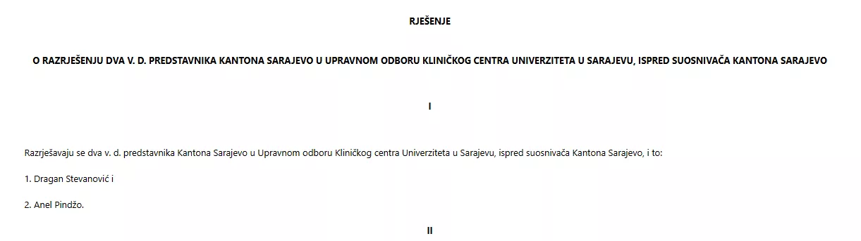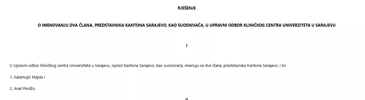 "Konačno imenovanje predstavnika Kantona Sarajevo iz tačke I ovog rješenja je u nadležnosti Vlade Federacije Bosne i Hercegovine, na prijedlog Federalnog ministra zdravstva. Obavezuje se Federalno ministarstvo zdravstva da provede proceduru konačnog imenovanja dva (2) člana, predstavnika Kantona Sarajevo iz tačke I ovog rješenja. Mandat članova Upravnog odbora Kliničkog centra Univerziteta u Sarajevu, traje četiri (4) godine, računajući od dana imenovanja od strane Vlade Federacije BiH", navodi se u objavi u Službenim novinama KS.
