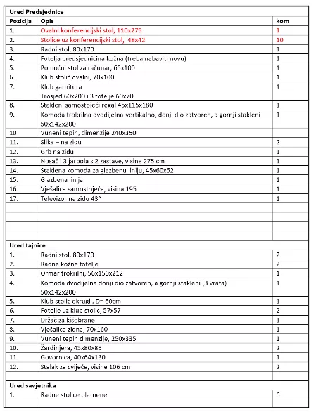 U tenderskoj dokumentaciji za nabavku namještaja i mobilijara, uz detaljan opis i karakteristike, postavljene su fotografije stolica, stolova, sofa koje žele nabaviti.