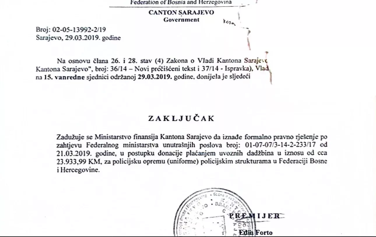 Vlada Kantona Sarajevo sa Edinom Fortom 29. marta 2019. godine donosi zaključak kojim zadužuje Ministarstvo finansija Kantona Sarajevo da "iznađe formalno-pravno rješenje" i izdvoji 23.933 KM za plaćanje uvoznih dadžbina za policijske uniforme koje su donirane "strukturama u Federaciji BiH".