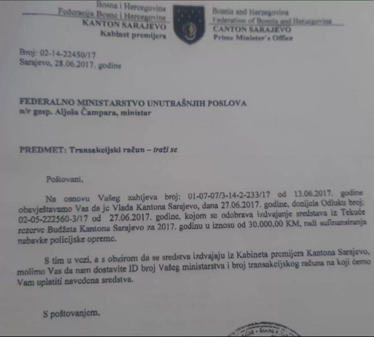 Tadašnji premijer Kantona Sarajevo Elmedin Konaković u junu 2017. goidne donosi odluku da iz Budžeta Kantona Sarajevo odobri 30 hiljada maraka za "sufinansiranje nabavke policijske opreme" Federalnom ministarstvu unutrašnjih poslova.