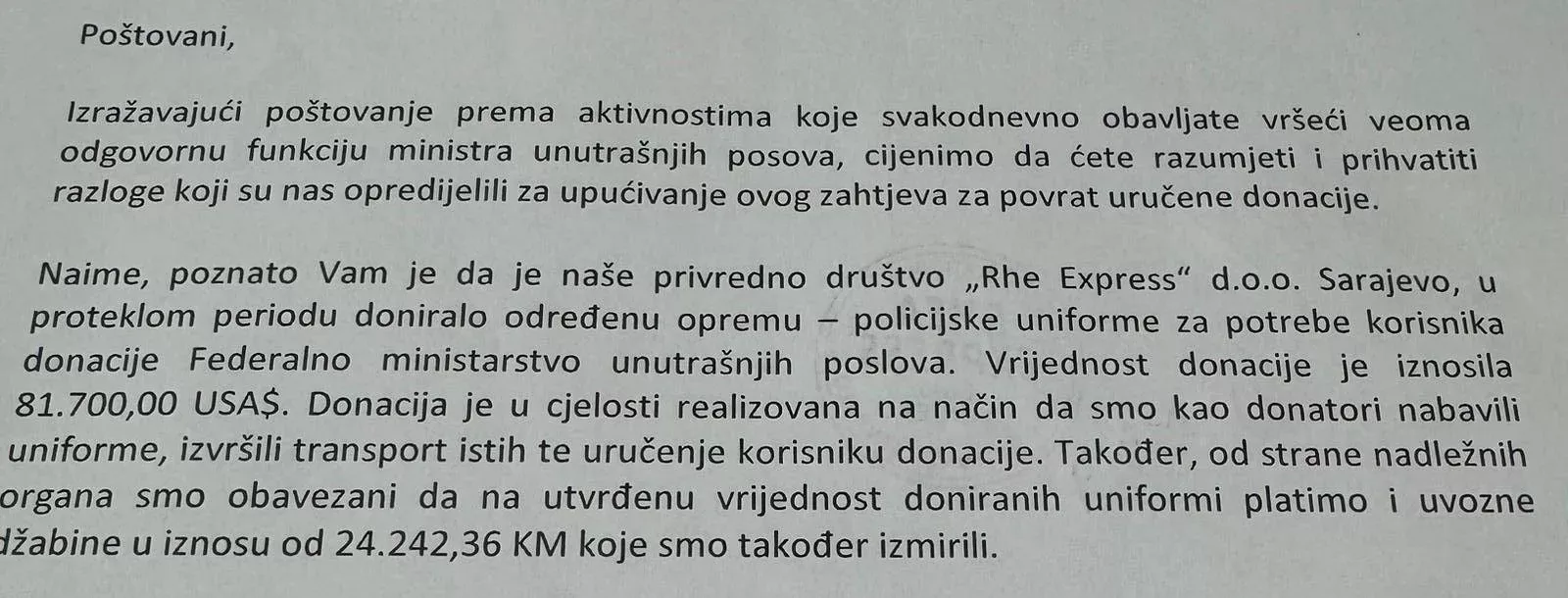 Naime, poznato Vam je da je naše privredno društvo 'Rhea Express' d.o.o. Sarajevo, u proteklom periodu doniralo određenu opremu - policijske uniforme za potrebe korisnika donacije Federalno ministarstvo unutrašnjih poslova.