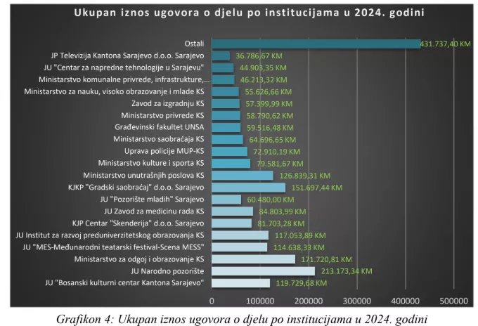 Institucije sa najvećim iznosom utrošenog novca na ugovore o djelu u 2024. godini su: JU Narodno pozorište Sarajevo, Ministarstvo za odgoj i obrazovanje Kantona Sarajevo i KJKP “Gradski saobraćaj” d.o.o. Sarajevo.