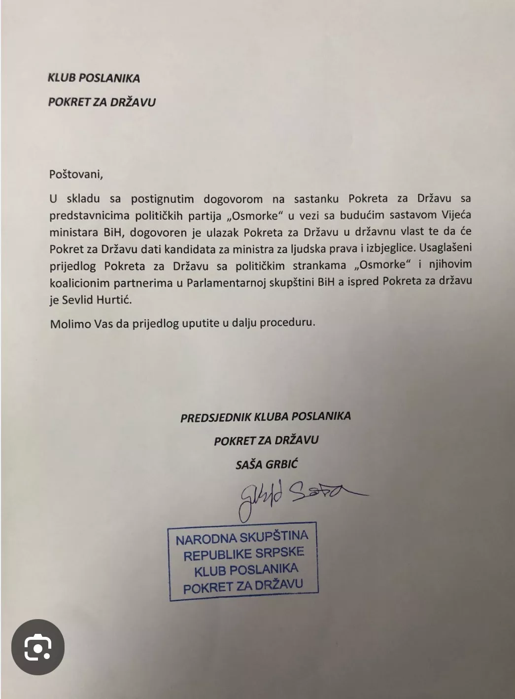Jer, Hurtić je bio prijedlog ne SNSD, već upravo SDP-a, tačnije svoj potpis za njegovo imenovanje je dao upravo Grbić ispred Pokreta za državu.