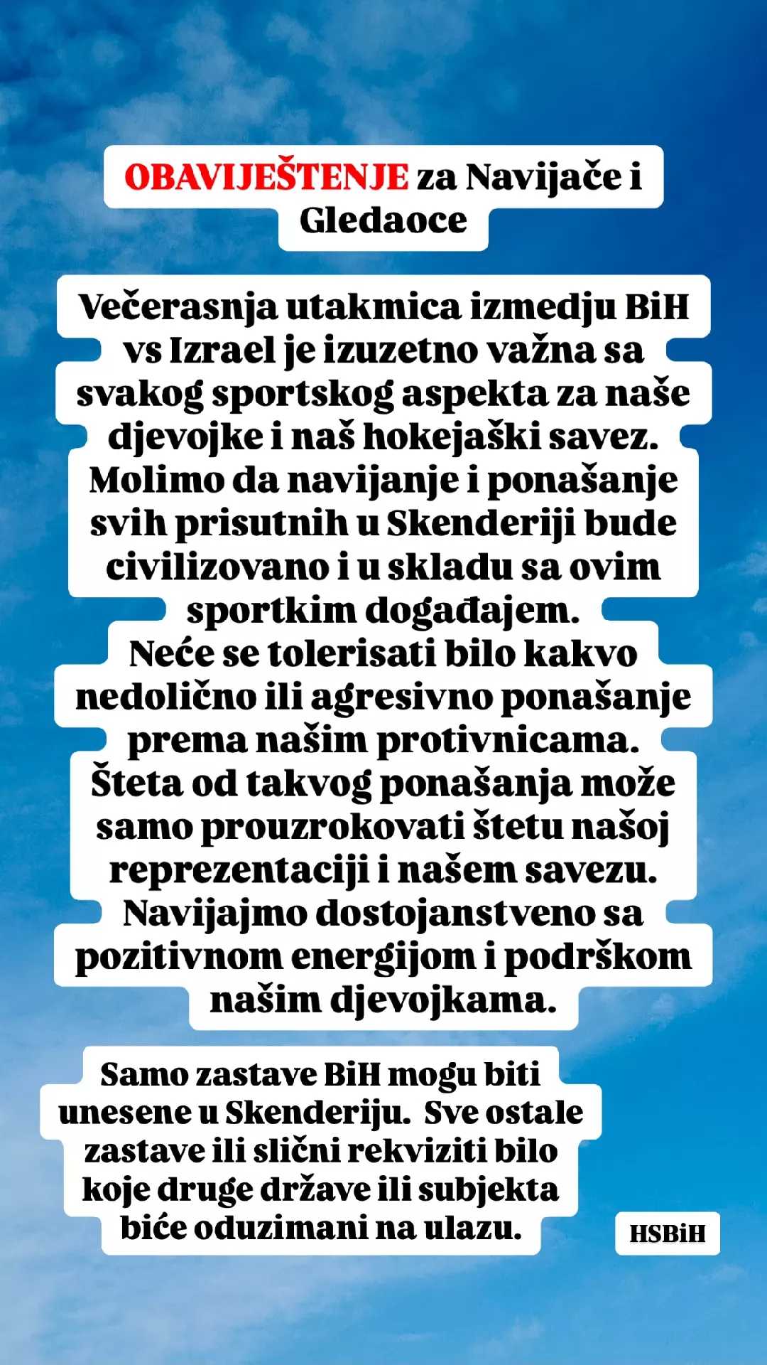 "Molimo da navijanje i ponašanje svih prisutnih u Skenderiji bude civilizovano i u skladu sa ovim sportskim događajem. Neće se tolerisati bilo kakvo nedolično ili agresivno ponašanje prema našim protivnicama.